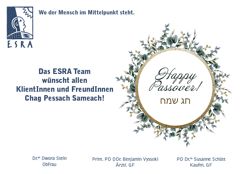 Das Team vom Psychosozialen Gesundheitszentrum ESRA wünscht allen FreundInnen und KlientInnen Chag Pessach Sameach! Wir sind füreinander da und wünschen viel Wärme und Zuversicht. Frohe Festtage und alles Liebe aus ESRA!
